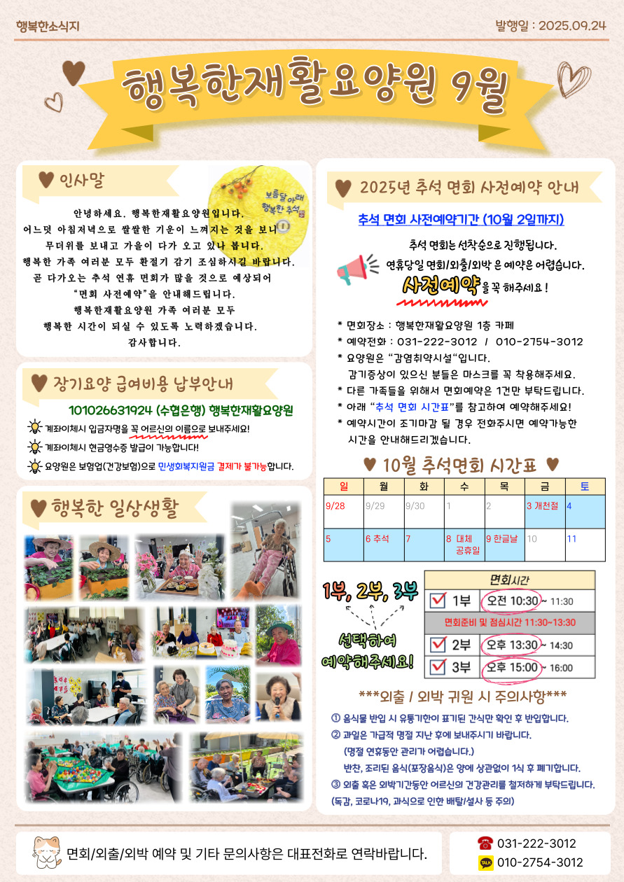 사진구경하기 목록 2025년 9월 안내문 페이지 정보 행복한요양원 25-09-29 11:50 11회 0건 관련링크 목록 본문 2025년 9월 안내문 댓글목록 등록된 댓글이 없습니다. 목록